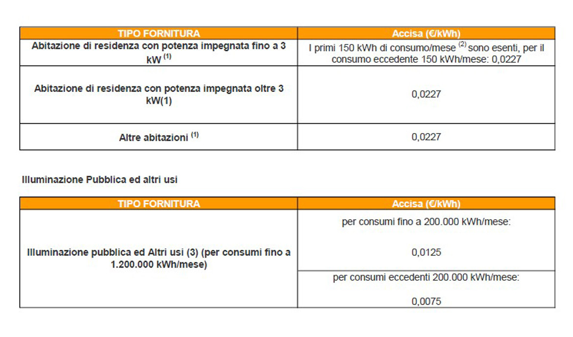 (1) su tutte le utenze domestiche si applica la stessa aliquota di accisa. Per le utenze con potenza impegnata fino a 3 kW e residenza anagrafica, è prevista una esenzione applicata solo se i consumi mensili non superano i limiti prefissati (vedi nota 2).